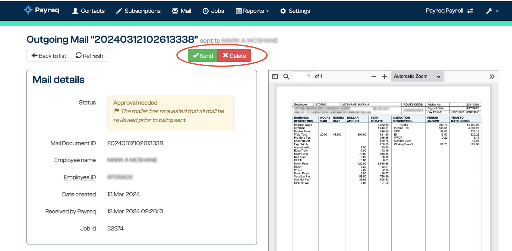 - Once approved, the mail is processed and delivered through Payreq as normal.
