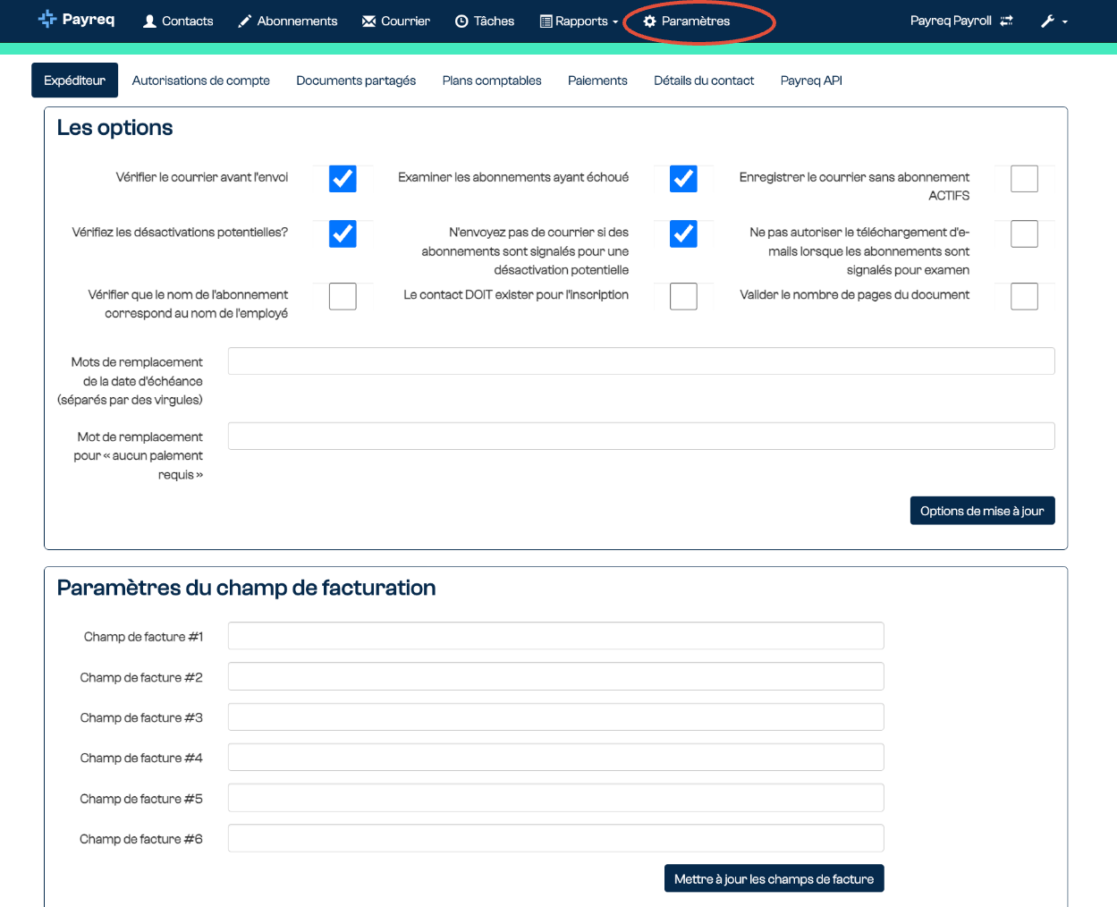 Remarque : la plupart des organisations auront ces options configurées lors de l’intégration initiale. Avant de faire des changements, consultez votre partenaire d’impression (mailhouse) ou le soutien Payreq.